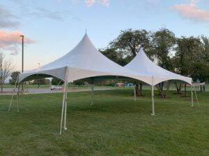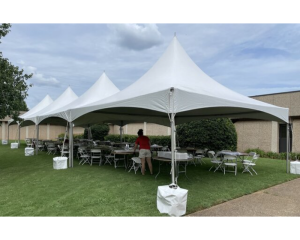 Our 20×20 High Peak Tent is a customer favorite for its clean, elegant design and sturdy build. With 400 sq. ft. of space, it seats up to 40 guests at four 5-ft round tables (10 per table) or 48 guests at six 8-ft rectangular tables. Perfect for weddings, graduation parties, or gameday setups.